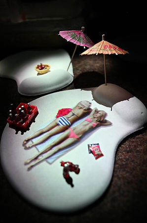 Dollshouse Divas: A projected pair of girlfriends trying on the clothes of a real Barbie doll.