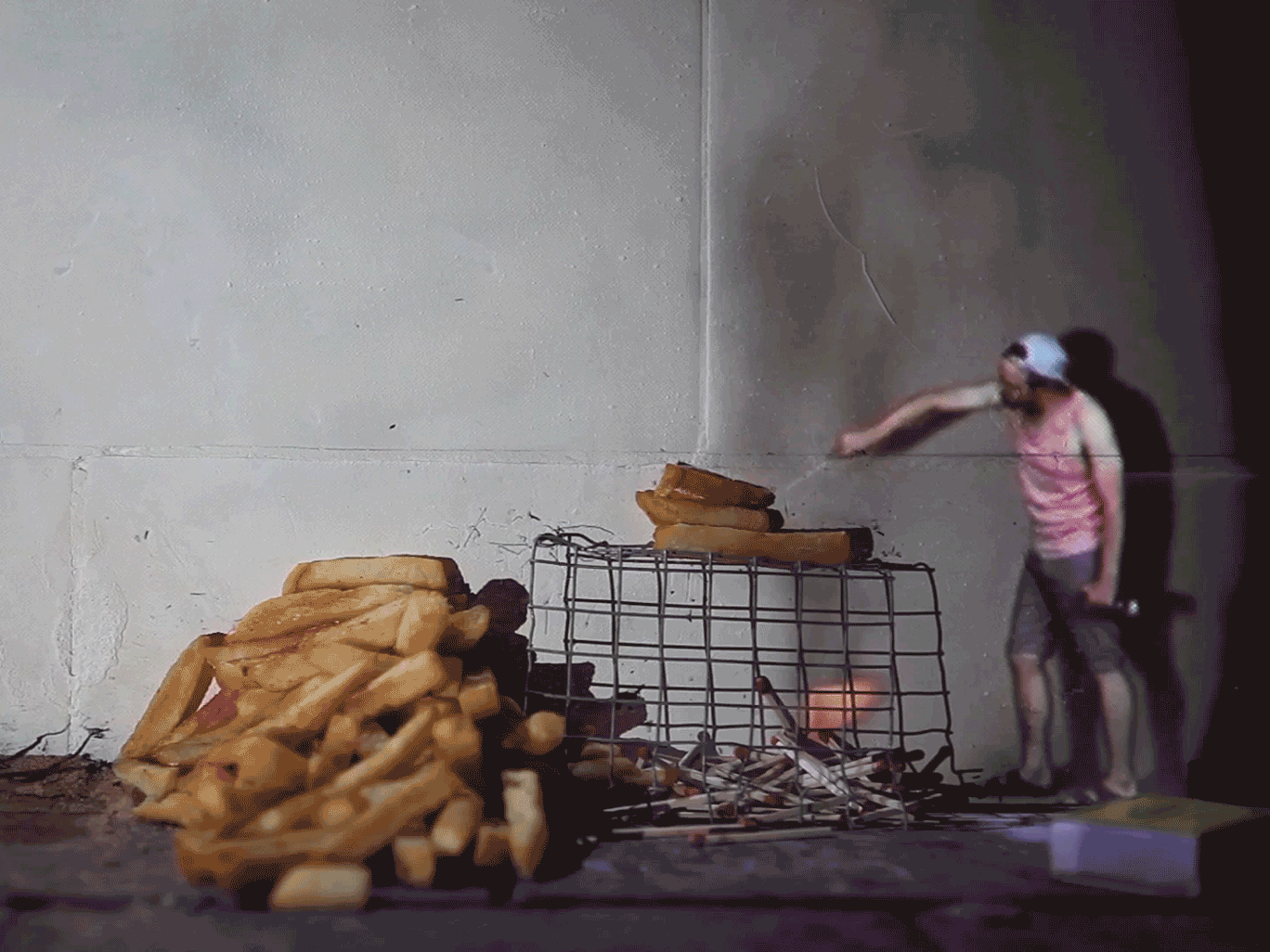 Pocket Sized People is a public installation featuring mini projections of tiny 10cm characters inventively making use of everyday human waste. In a world where children’s sandpits become holiday resorts, a single French fry is a family meal and a small swarm of flies becomes a deadly stampede, these mischievous mini men survive, strive and thrive.